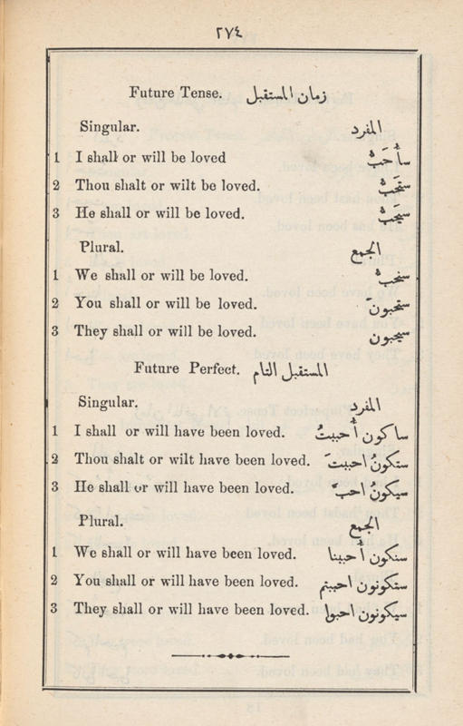 HA: Ah, it’s the first English–Arabic dictionary published in the US, back in 1895. Our copy is autographed by the author, Ibrahim Arbeely, to Andrew Carnegie. It’s a phrasebook for all the situations someone might find themselves in, like going to the post office or being invited over to an American family’s house. There’s a sequence in here that I find so moving: “I may be loved. I might be loved. I may have been loved.”